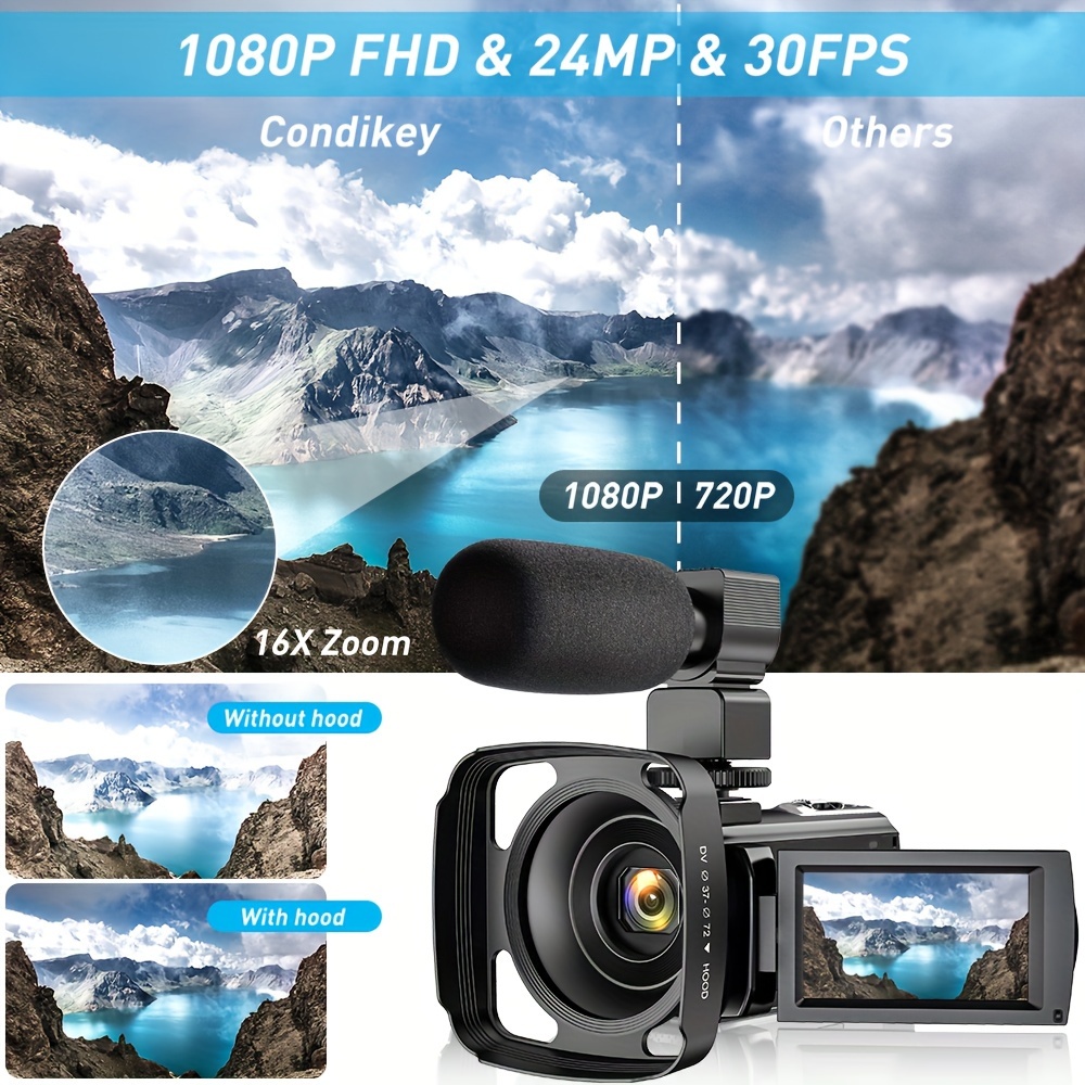 Nicamery 16x Efficient Zoom - 1080P HD Camera with Beauty Anti-Shake, External Microphone Support - Full HD 2400 Pixel Webcam Digital Camera with Remote Control, Lens Hood, 1000mah Batteries 2pcs, Ultra Long Life, 32G TF Card