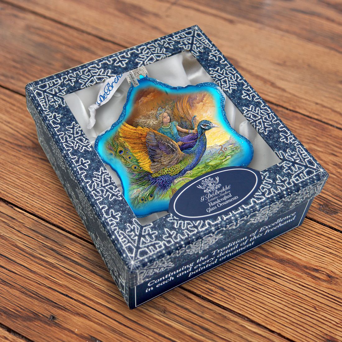 About Collection: This "Holiday Splendor Glass Ornaments Collection has been inspired by old world-Eastern European families, who for almost 200 years had painted beautiful miniature lacquered paper-m?›ch?? boxes inlaid with mother of pear. It took years of perfecting this technique to establish this new and innovative form of painting that we now proudly present in our exclusive G. DeBrekht Glass ornaments. They are made, as in the old days- from 1.5 mm hand-blown Mercury Glass, silver powdered from the inside and then sandblasted from the outside. The combination of colors and the multi-layer painting techniques create a deep iridescent effect. We take pride in perfecting every piece by adding touches of gold, finishing them with a lovely satin ribbon, and presenting them in a luxurious satin-lined box. Hand-made in the USA, every piece is unique- and will be passed on to future generations to cherish.