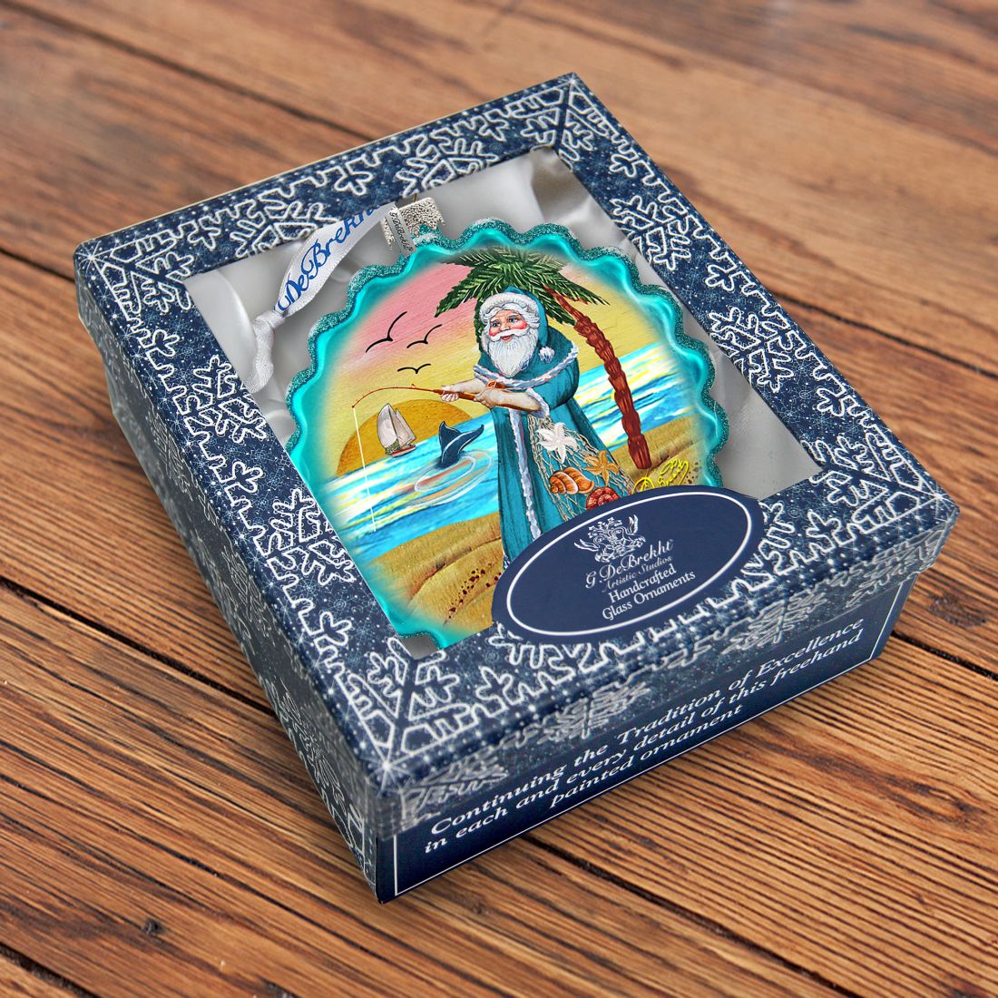 If you are looking for accent Christmas ornaments for your tree, check out G. Debrekht's superb selection of Glass Christmas Tree Ornaments. All hand handmade in the USA, the Fishing Santa at the Palm Trees will stand out and will become a centerpiece of your Christmas tree.