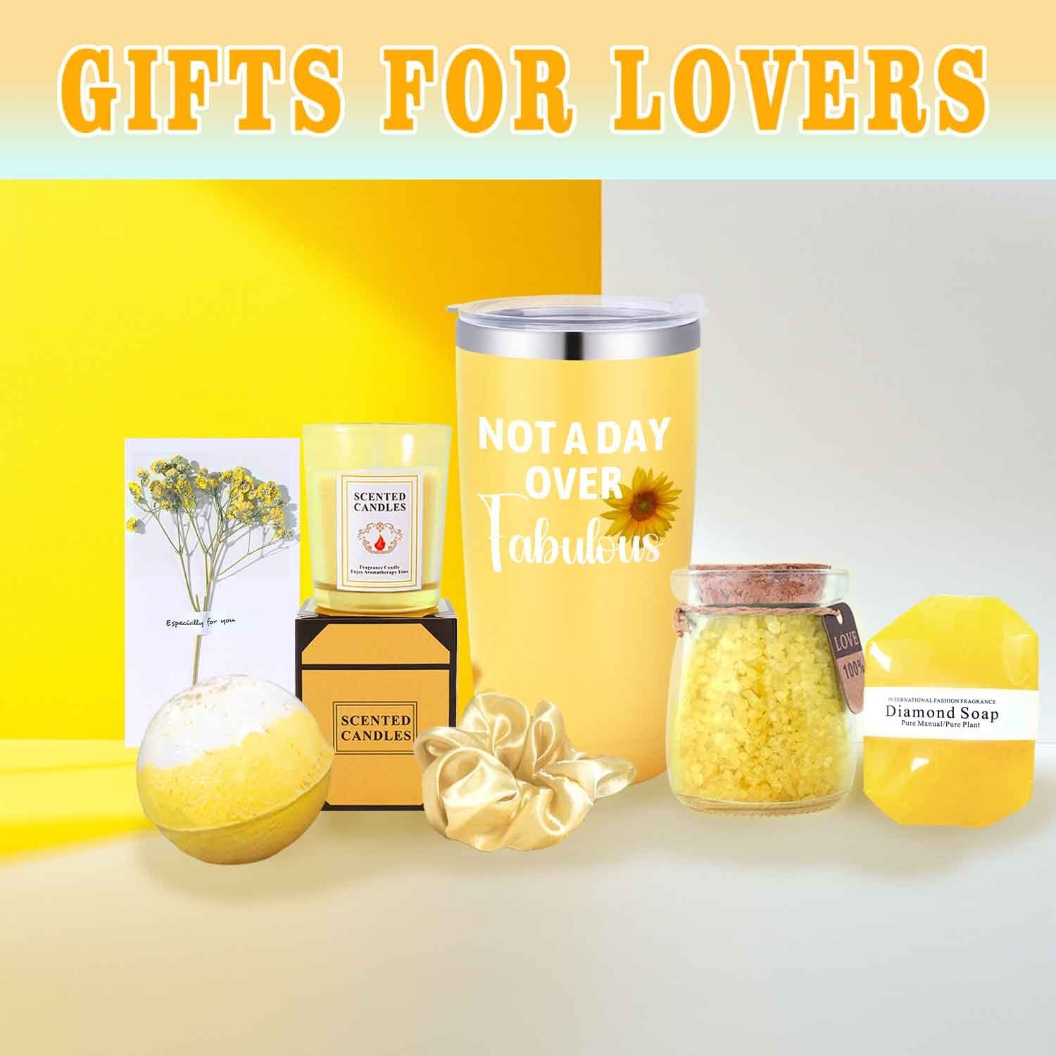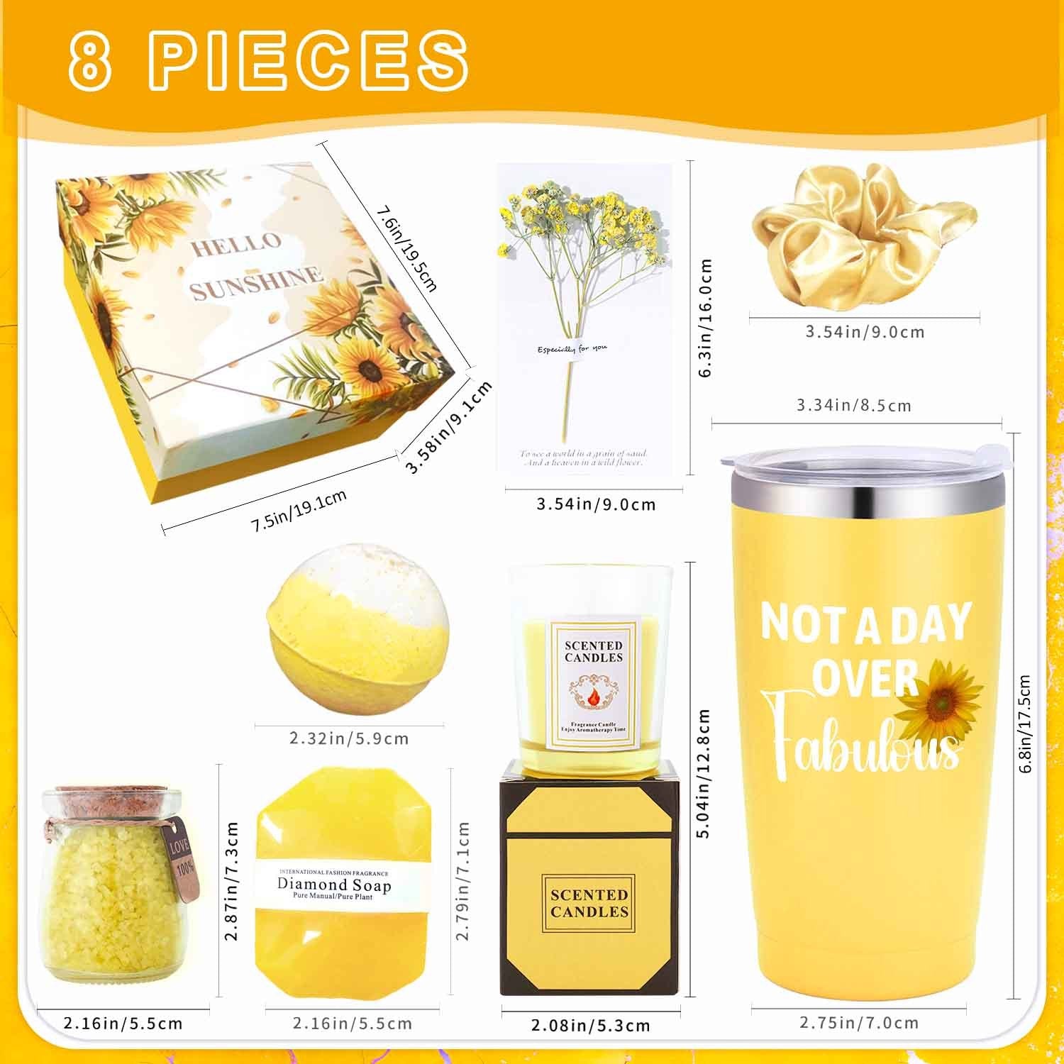 8pcs Fabulous Yellow Gift Set for Women - Includes Insulated Tumbler, Greeting Card, Hair Tie, Scented Candle, Bath Salts, Bath Bomb, Soap, and Elegant Gift Box - Perfect for Christmas & Thanksgiving, Gift Set, Scented Candle