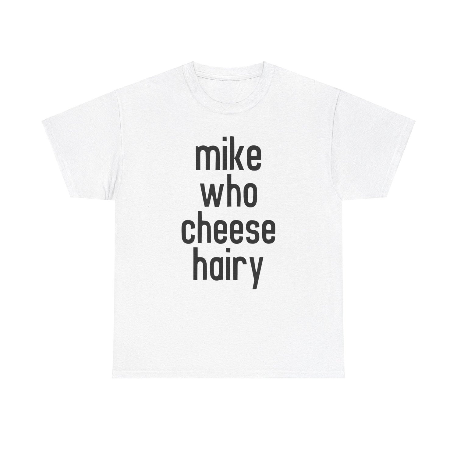Mike Who Cheese Hairy Funny Adult Humor Word Play T-Shirt - White / S is backordered and will ship as soon as it is back in stock.