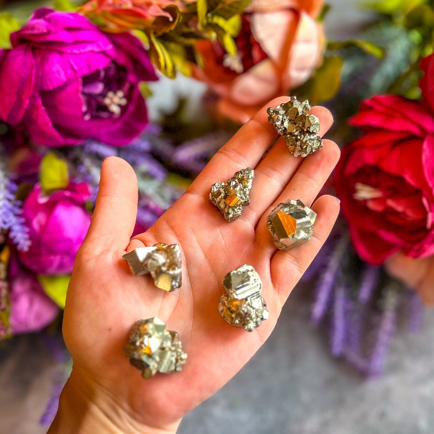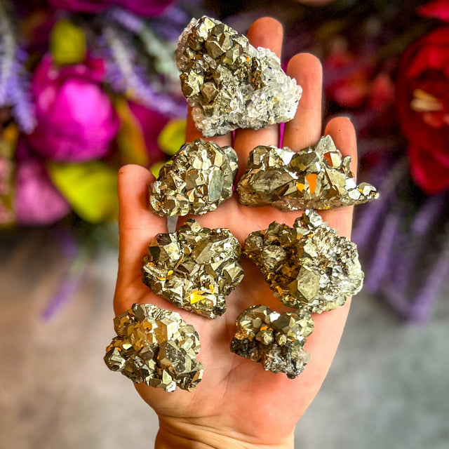 Each cluster showcases the radiant beauty of pyrite, with its dazzling metallic luster and intricate crystalline formations. As you run your fingers across the surface, you'll feel the cool, smooth texture of these golden treasures, like holding a piece of the sun in the palm of your hand.