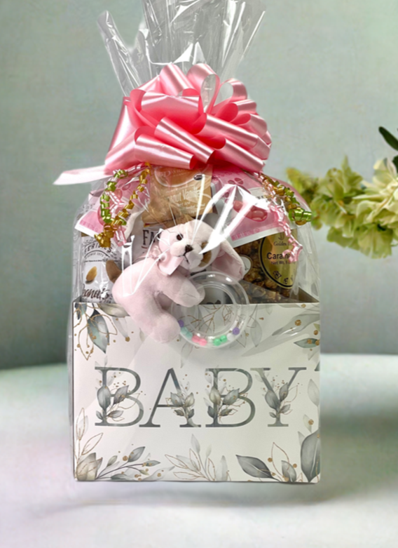 Includes Baby rattle for a girl or boy, 2 Pepperidge Farm Crackers, Farmhouse Cookie Bag, Goldfish,  Feridies 3oz Peanut Bag, Caramel Popcorn, Milano Cookies, Chessmen Cookies or Veronas, and 2 New Baby packets of Jelly Beans (It's a Boy or Girl!)