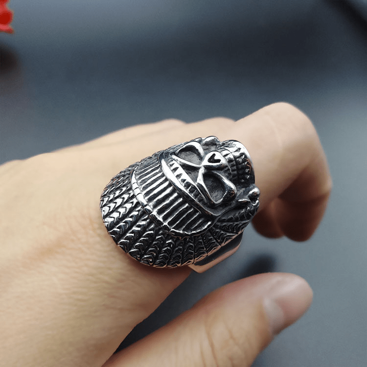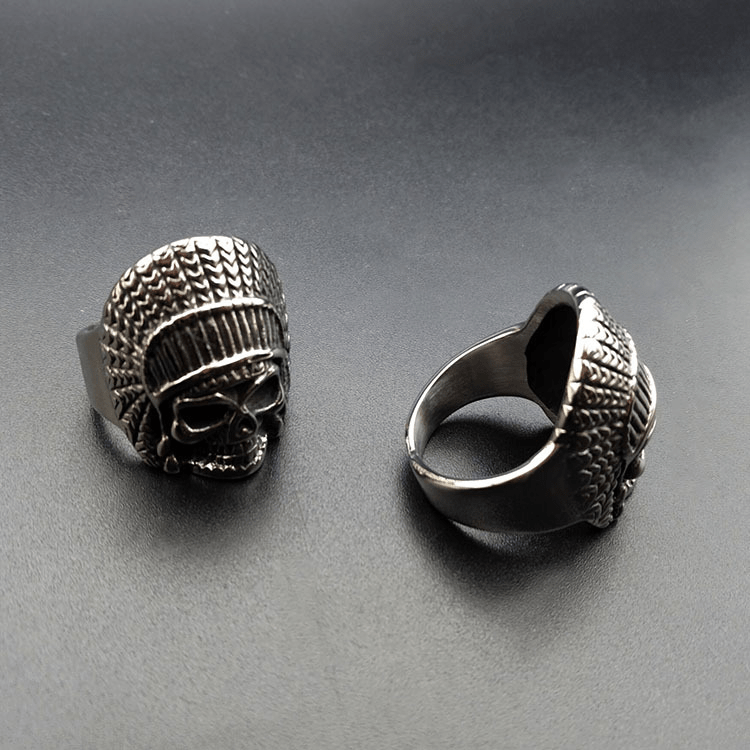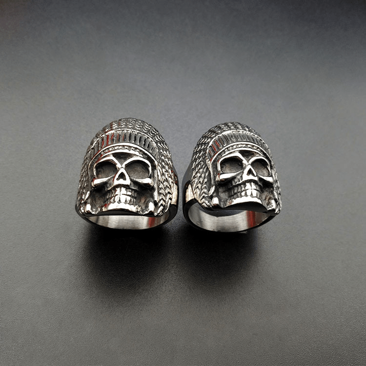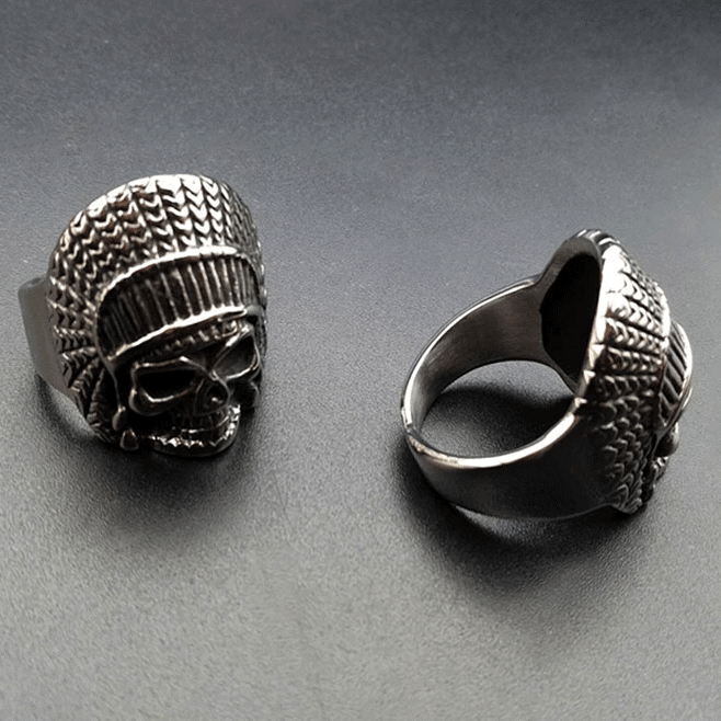 Gritty and unafraid, this large skull ring is a daring addition on any hand. Featuring a Indian skull face with carefully crafted detail, this ring features remarkable tribal detail. It’s ethnic, tribal design pairs well with a wide range of outfits and looks great with biker wear, rocker wear and leathers.