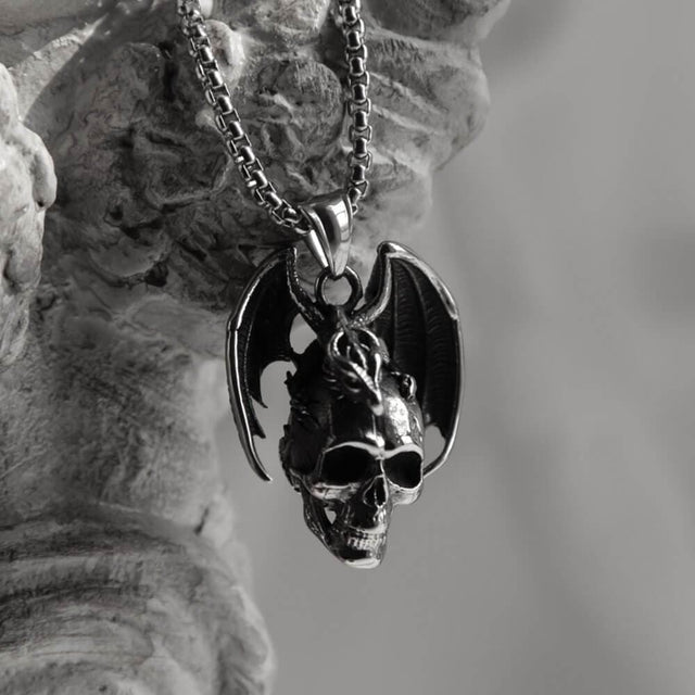 The design of this pendant is a combination of dragon and skull, which creates a look that is evil and glamorous. The dragon is a symbol of the beast par excellence, the adversary, and the devil. In most traditions, it is the embodiment of chaos and untamed nature. It is associated with the depths of the unknown sea, with the mountaintops, and with the clouds. As a well-known element, the skull symbolizes death, reminder, equality, and so on.