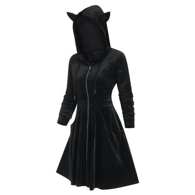 Immerse yourself in the allure of Gothic fashion with our polyester and velvet Gothic Black Devil Horn Hooded Dress. Sculpting a silhouette of timeless elegance, this dress is designed to be devilishly stylish while offering unmatched comfort. Elevate your wardrobe with a touch of dark enchantment - experience the sublime velvet embrace now.