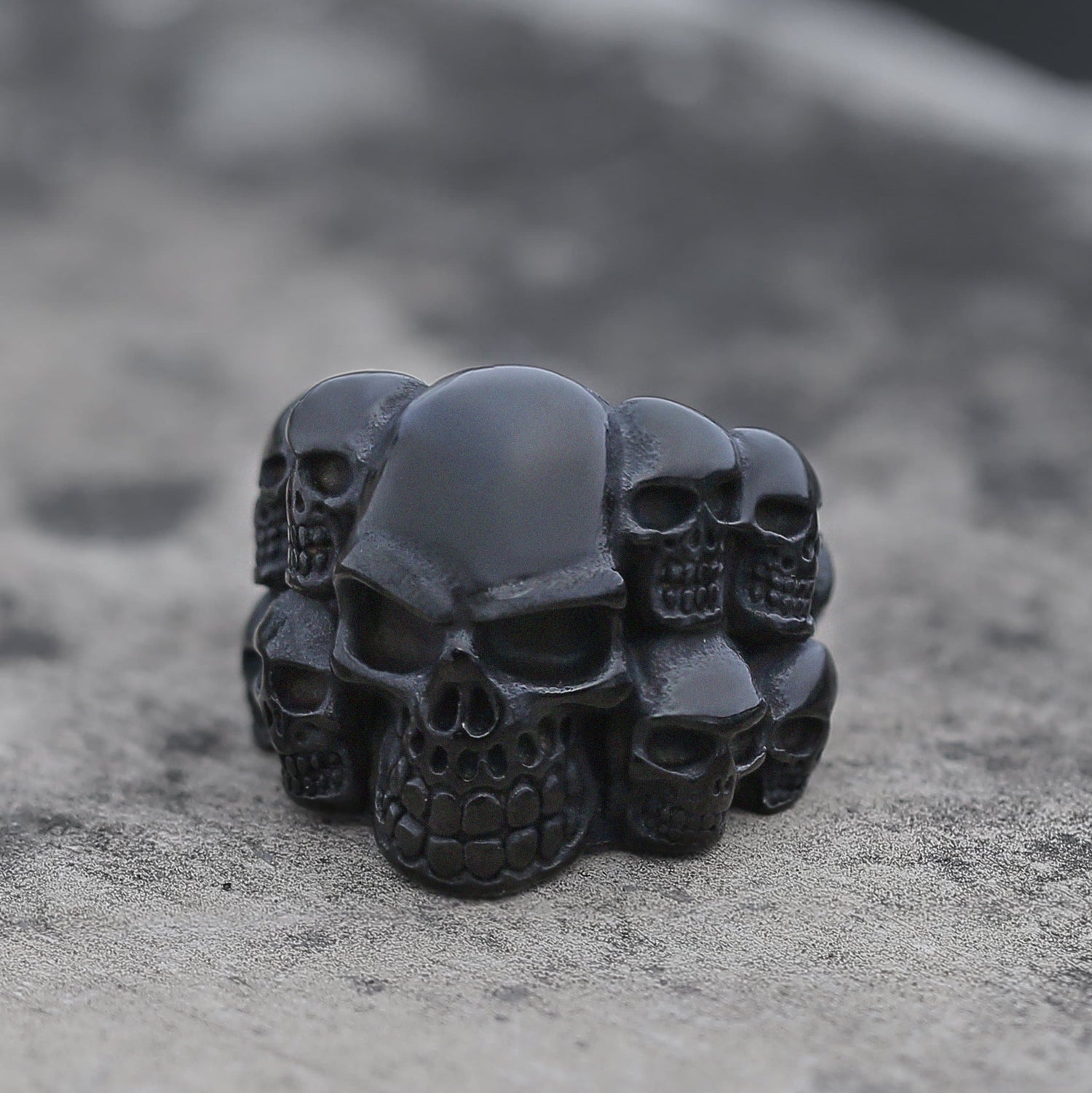 This ring features a total of eleven spooky skulls for a look that is edgy, unique and slightly terrifying! An everlasting symbol of death and mortality, this impressive, gothic ring is certain to attract attention. The deep, dark eye crevices really stand out, while every tooth has been given the same amount of attention to ensure maximum impact.