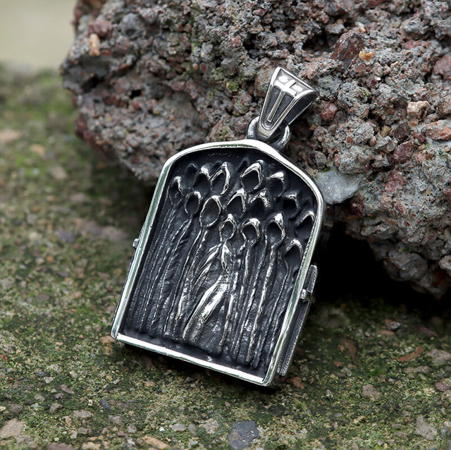 Featuring many skulls in long robes, finely crafted, this pendant allows you to show off your faith in a unique and stylish way. It has crosses on both sides and the back, delicate and simple. This pendant represents rebirth among the ruins. It is a comfortable yet masculine pendant, one that you will not be disappointed with. Get yours today!