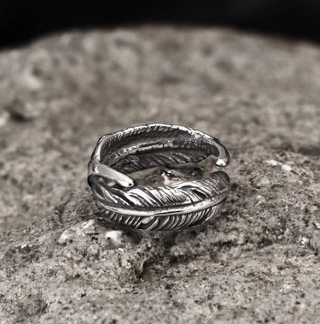 It is a stainless steel ring in feather-shaped. The feather often represents strength and growth, as well as hope and freedom. Birds fly freely in the clouds, closest to the spirit realm. Sometimes when a feather is in our path, it may be perceived as a message from the other side.