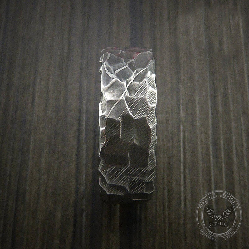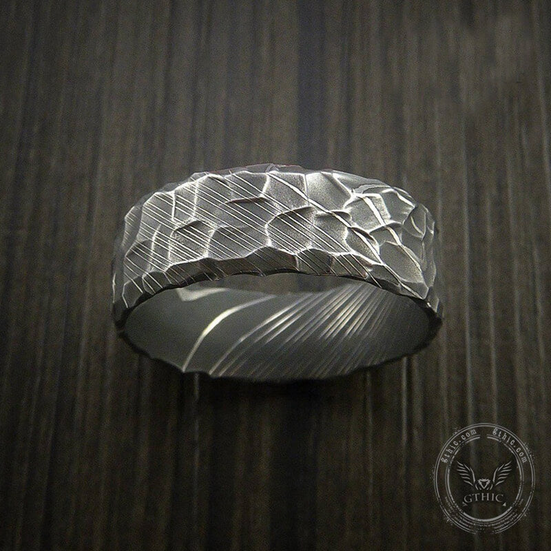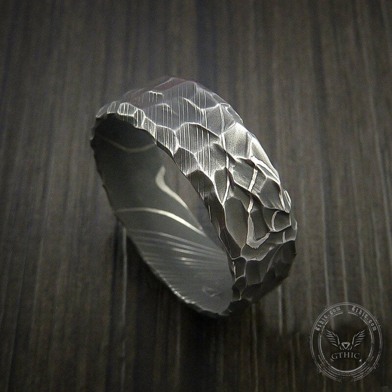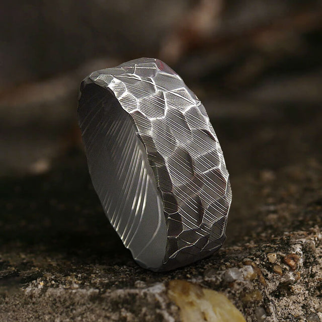 After quenching and roasting and manual beating many times, this exquisite and retro finished hammered Damascus steel ring makes it impossible to take the line of sight away. The hammer pattern on the surface gives people a feeling of vicissitudes of life, and the inside of the ring is polished to be very smooth as if it hadn't been beaten in any way.