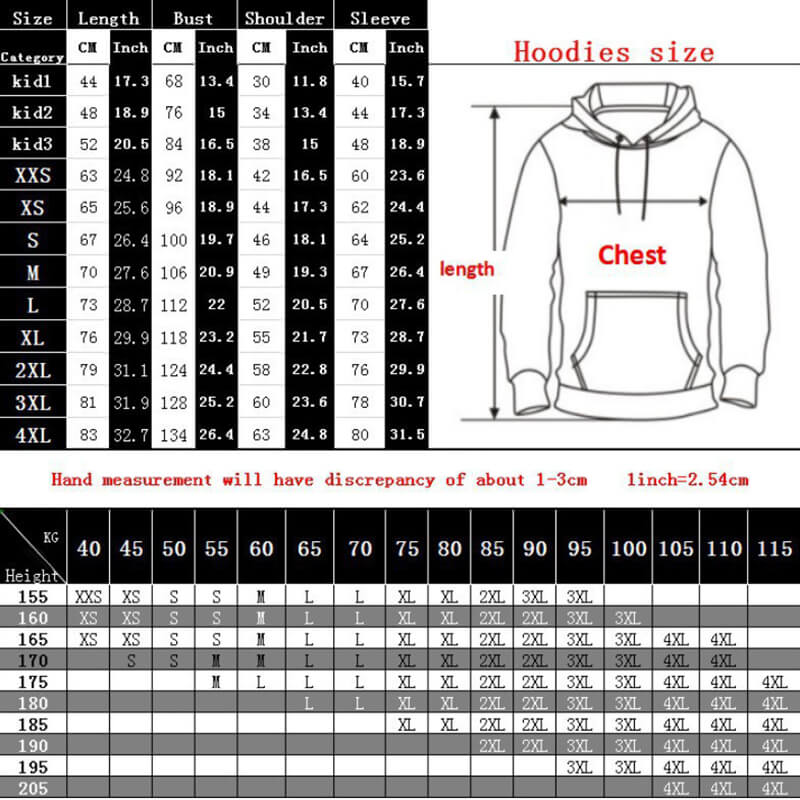 Size chart measurement is for reference only. Manual measurement error is about 1-3 cm. The hoodies size small enough, our team advises you 1 size above as a guarantee of safety.