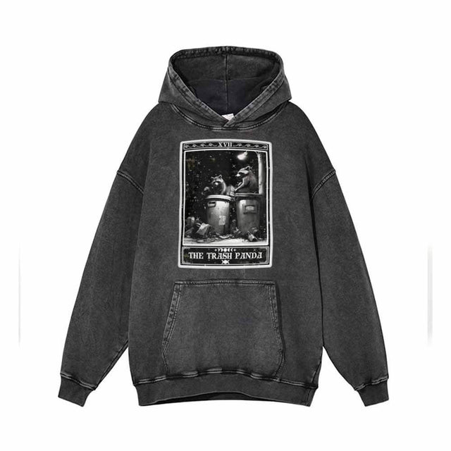 Enhance your wardrobe with The Trash Panda Tarot Card Vintage Washed Hoodie. This unique hoodie features a vintage washed design and is adorned with tarot card illustrations of your favorite mischievous animal, the raccoon. Embrace your inner spirit animal while staying cozy and fashionable.