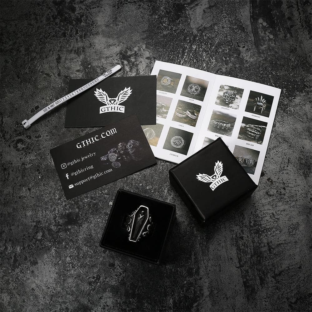 When you want a truly unique biker ring for your collection of accessory pieces, you cannot go wrong with the funeral vampire ring! Men's stainless steel ring, vampire coffin ring. Take your biker outfit to whole new heights with this stunning ring by acting now while they are still available!