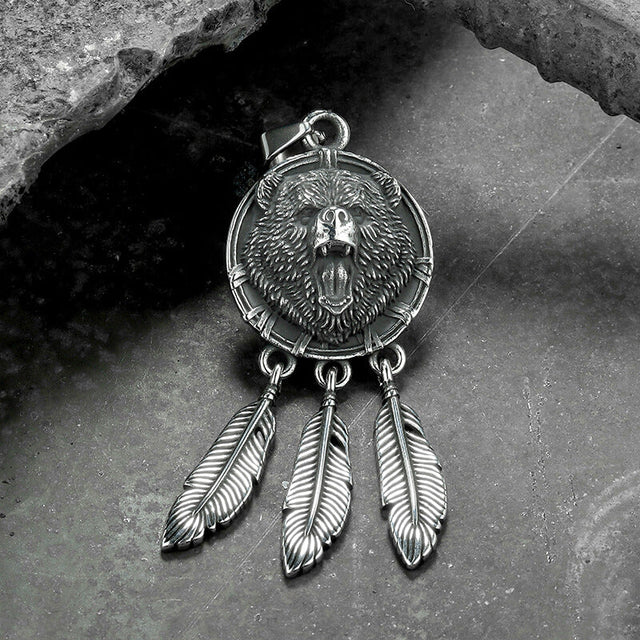 Vintage Feather Bear Head Stainless Steel Animal Pendant