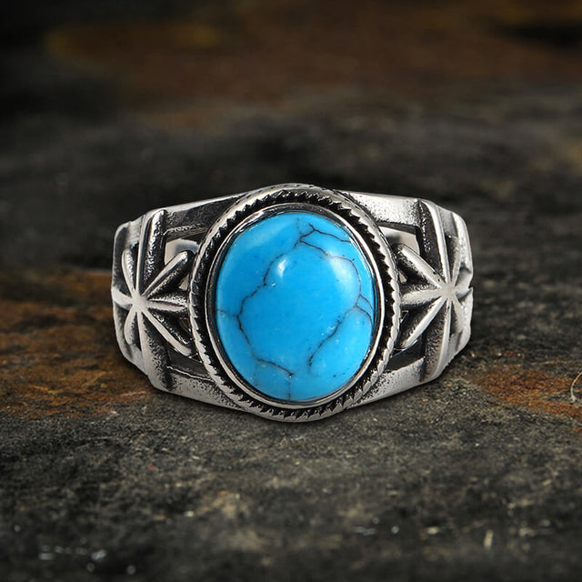 You won't want to miss this fantastic turquoise ring! Adorned with round blue turquoise stones, this ring is open-worked on both sides and has a simple pattern yet creates a masculine yet vintage look. Sturdy and durable, we offer first-class jewelry that will not lose its luster over time.