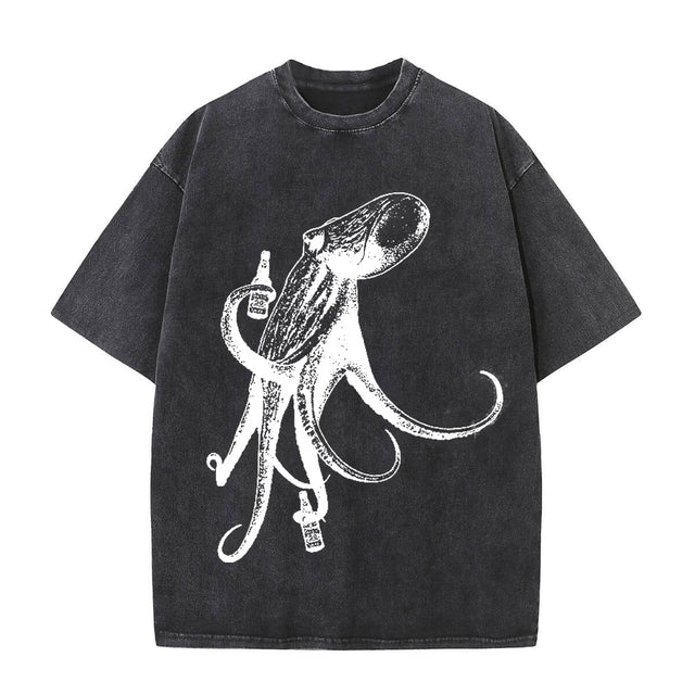 This vintage-washed t-shirt features a fun and unique design of a drinking octopus. Made from high-quality cotton, it provides a comfortable and stylish fit. Perfect for those who love vintage and marine life.