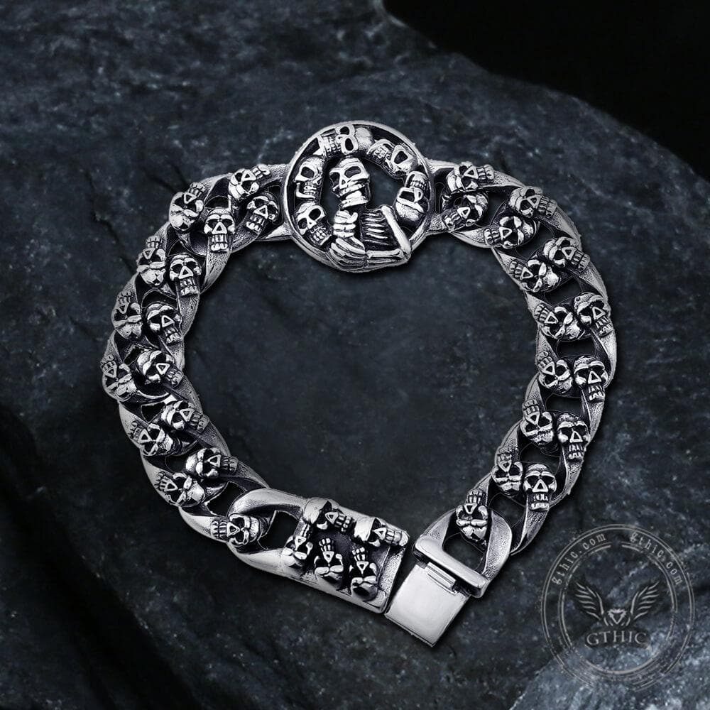 As the saying goes, three heads are better than one. These skulls are gathered together, discussing a big deal, seem to come up with some good ideas. There is a skull on each node of the bracelet, connected to the circle in the middle. This bracelet represents the wise, hope this bracelet can bring you the power of the soul.