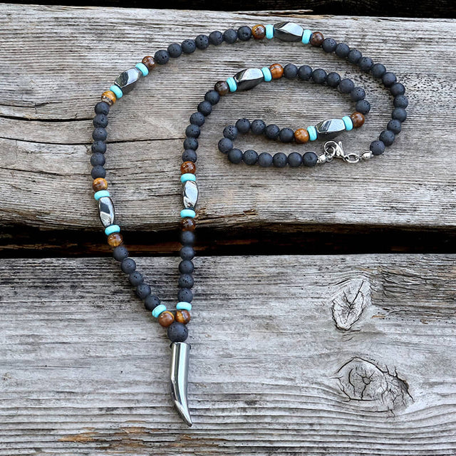 Made with natural stones and adorned with wolf's teeth, this necklace adds a touch of natural style and elegance to your style. Harness the power and ferociousness of the wolf and add it to your biker accessory collection with this stunning pendant. If you want to turn heads and impress your road tip buddies then this is one necklace you do not want to miss!