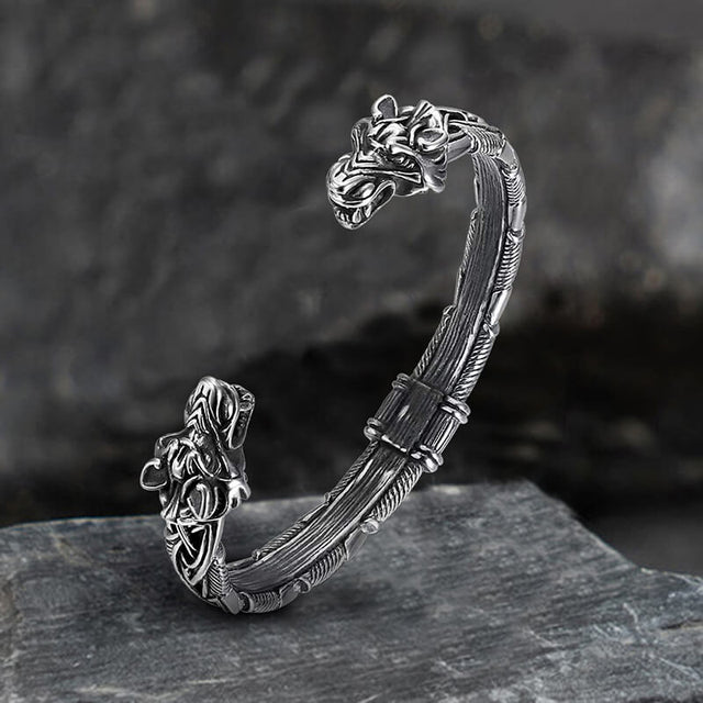 This is a classic Celtic torc bracelet. It were made from single or multiple intertwined metal rods, or "ropes" of twisted wire. And connected with wolf heads which seems retro and exquisite. The fierce and loyal wolf heads symbolize strength and guardianship, and it is filled with the glorious culture of the Vikings, a fighting people. Get yours today!