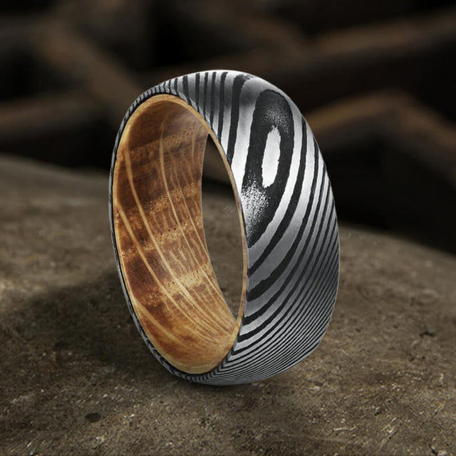 This simple and sophisticated ring is made of Damascus steel. Damascus steel, originally from ancient India. In modern times, it refers generally to steel with a patterned surface. Damascus steel is made by a forging process, which generally uses complementary steel materials forged together. The steel is made from layers of hard and soft materials that are both tough and extremely hard. Damascus steel rings are more resistant to rust.
