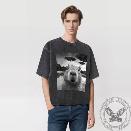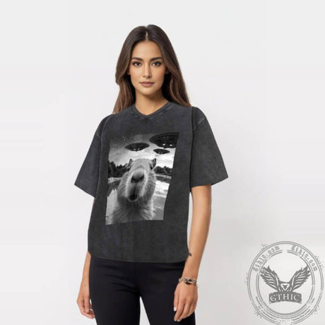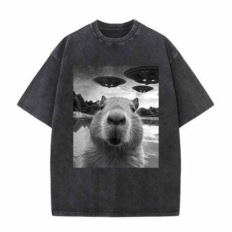 Vintage Weird Capybara Selfie UFO print T-Shirt