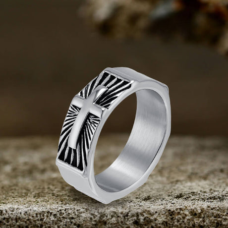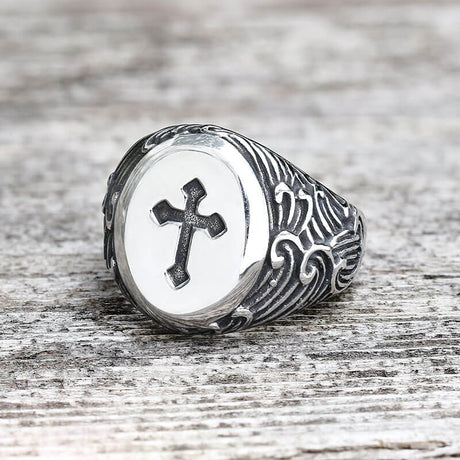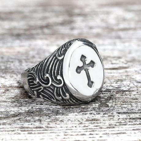 Wave Pattern Budded Cross Stainless Steel Ring
