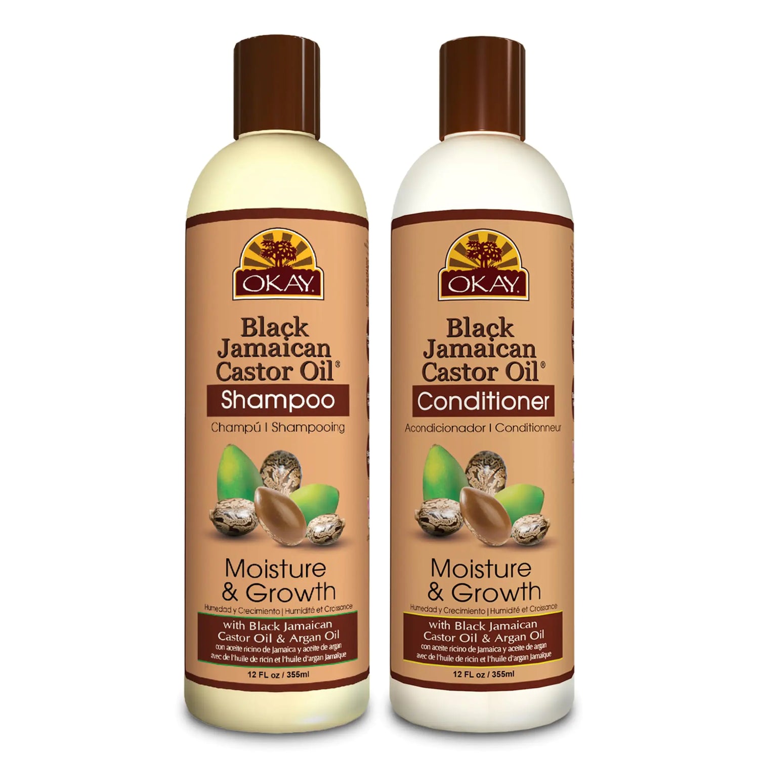 Black Jamaican Castor Oil Moisture Growth Shampoo Daily Cleanser Hair Strengthener with Black Jamaican Castor Oil Argan OilStronger richer fuller hair growth begins with the right shampoo. OKAY Moisture Growth Shampoo with Black Jamaican Castor Oil and Argan Oil will help hair growth by moisturizing dry stressed damaged hair. This daily shampoo is the 1st step for cleansing and reconstructing the hair in preparation for hair growth.Directions: Wet hair thoroughly. Apply shampoo and while building a good lather gently massage onto hair scalp. Rinse and repeat. For Best Results; condition hair after with OKAY Black Jamaican Castor Oil Moisture Growth Conditioner. For maximum benefits use with the complete line of Paraben Free Black Jamaican Castor Oil products by OKAYIngredients: Water (Aqua) Sodium C14-16 Olefin Sulfonate Cocamidopropyl Betaine Cocamide MEA PEG-120 Methyl Glucose Dioleate Guar Hydroxypropyltrimonium Chloride Hydrolyzed Wheat Protein Ricinus Communis (Castor) Seed Oil Argania Spinosa (Argan) Kernel Oil Glycol Distearate Polysorbate 20 Ceteth-10 PEG-8 Citric Acid Sodium Benzoate Potassium Sorbate Disodium EDTA Fragrance FD&C Yellow #5 (Cl 19140)Moisture Growth Conditioner. Rich Hydrating Detangling Lotion with Black Jamaican Castor Oil Argan Oil.Stronger richer fuller hair growth needs to be properly conditioned to prevent breakage and stimulate growth. Moisture Growth Conditioner with Black Jamaican Castor Oil and Argan Oil will help hair become comparably softer and detangles brittle hair with rich hydrating ingredients. This conditioner should be used every day after shampooing. This is the 2nd step which provides conditioning therapy to help revive brittle hair.Directions: Apply conditioner to wet hair and massage in for 5 min. Rinse off after. For maximum hair growth; use along with the complete line of Black Jamaican Castor Oil produc