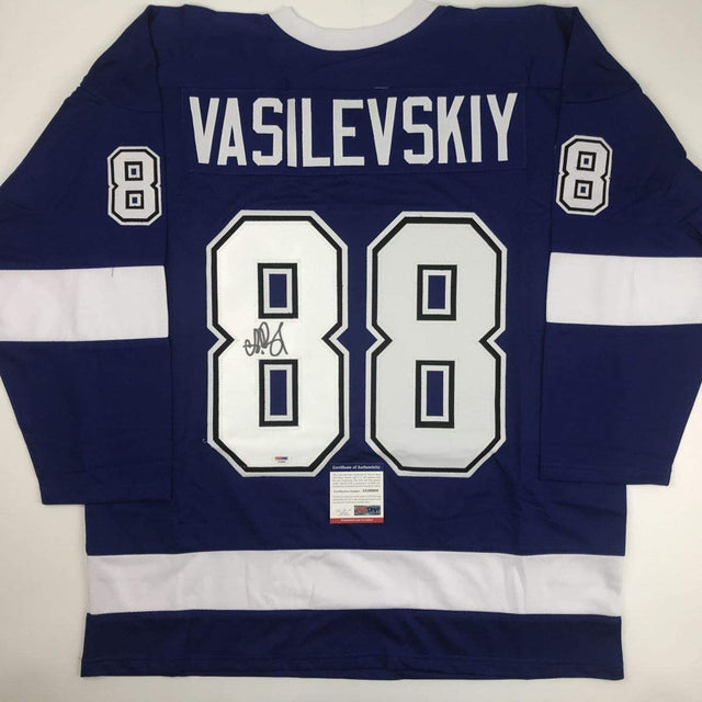 Autographed/Signed Andrei Vasilevskiy Tampa Bay Blue Hockey Jersey PSA/DNA COA is backordered and will ship as soon as it is back in stock.