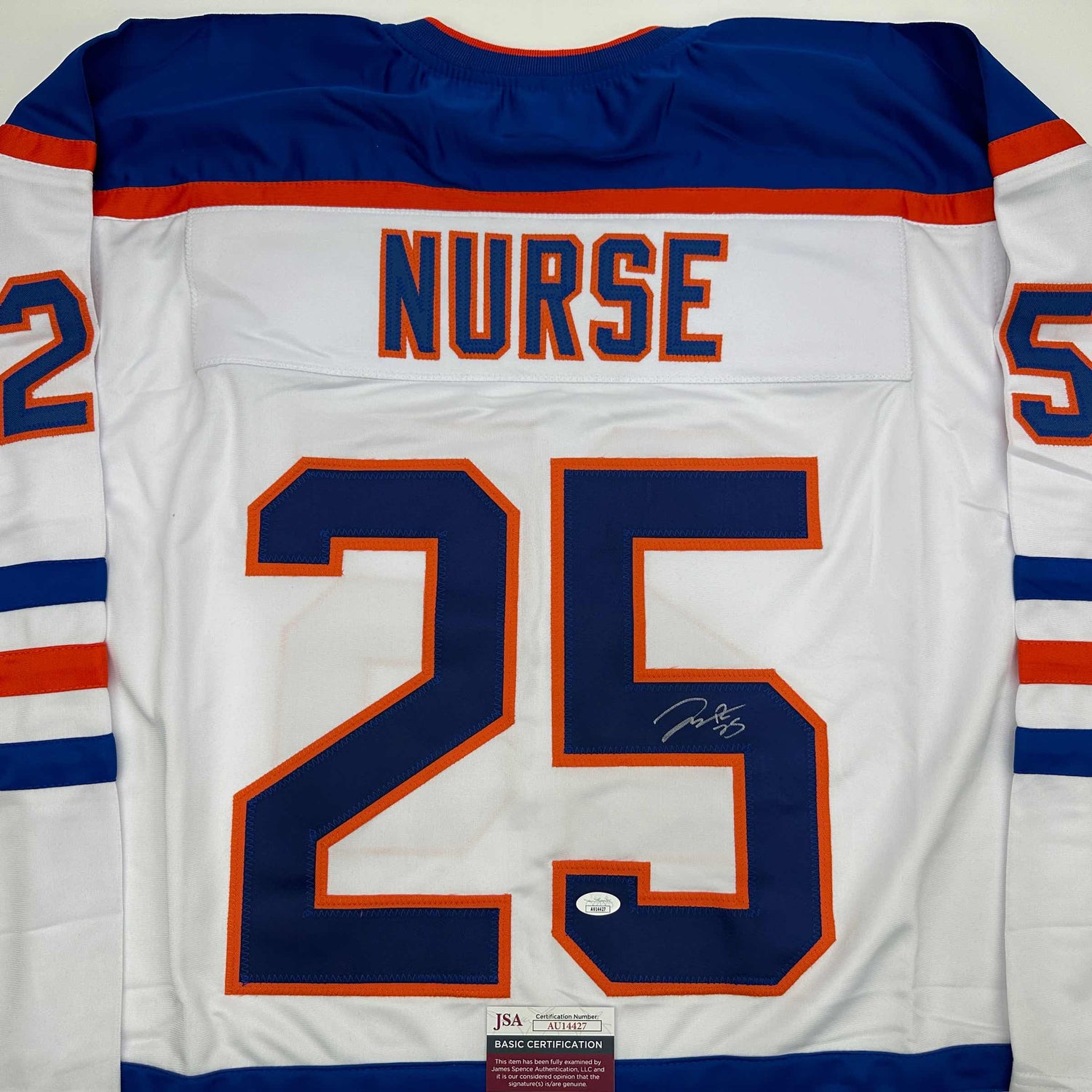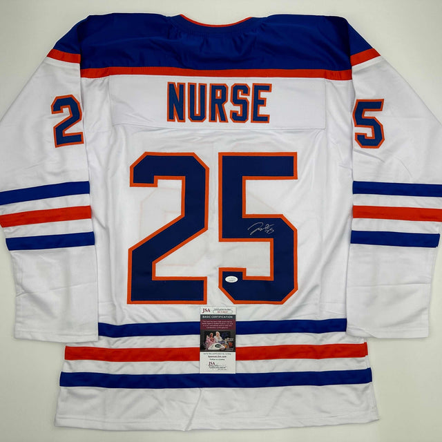 Autographed/Signed Darnell Nurse Edmonton White Hockey Jersey JSA COA is backordered and will ship as soon as it is back in stock.