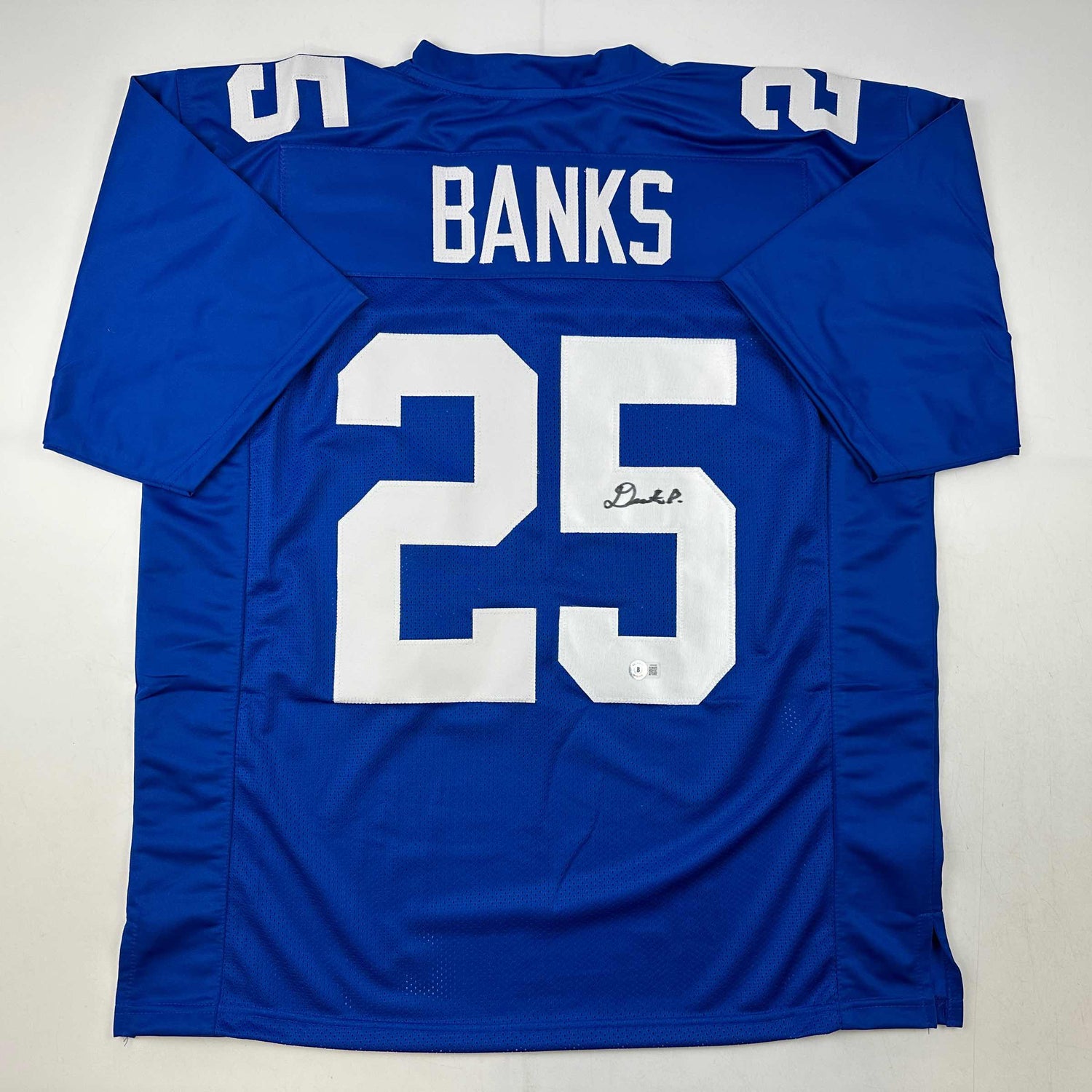 Autographed/Signed Deonte Banks New York Blue Football Jersey Beckett BAS COA is backordered and will ship as soon as it is back in stock.