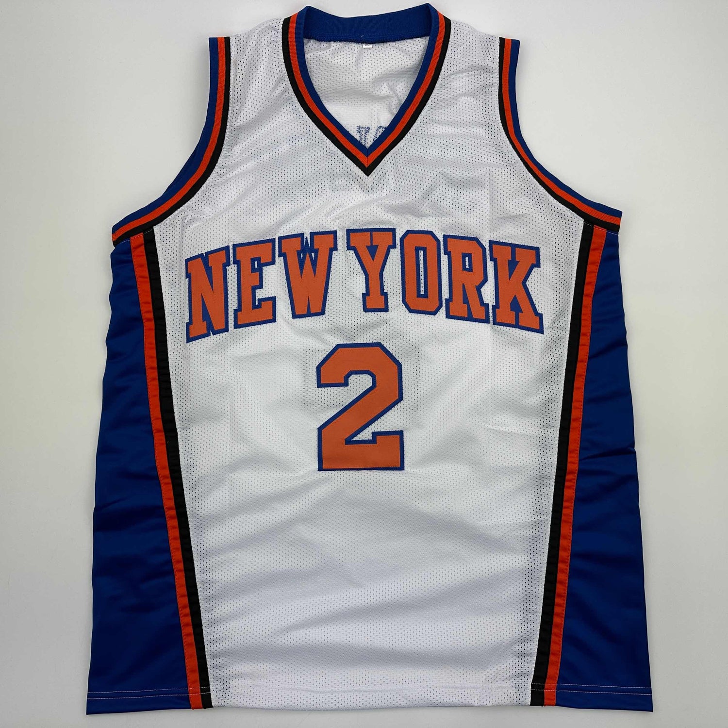 Autographed/Signed Larry Johnson New York White Basketball Jersey Beckett BAS COA