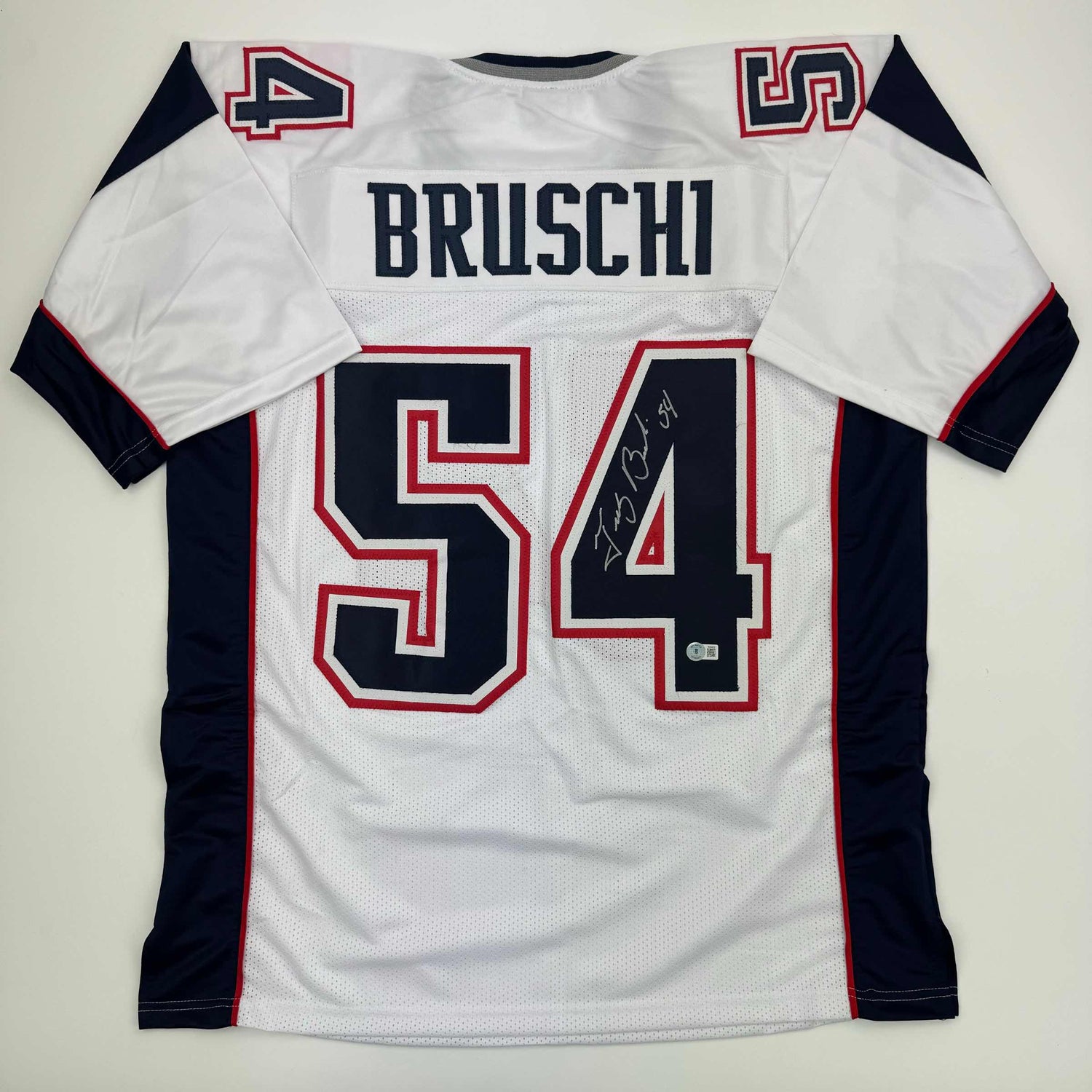 Autographed/Signed Tedy Bruschi New England White Football Jersey Beckett BAS COA