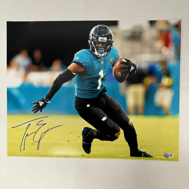 Autographed/Signed Travis Etienne Jr Jacksonville Jaguars 16x20 Football Photo Beckett BAS COA