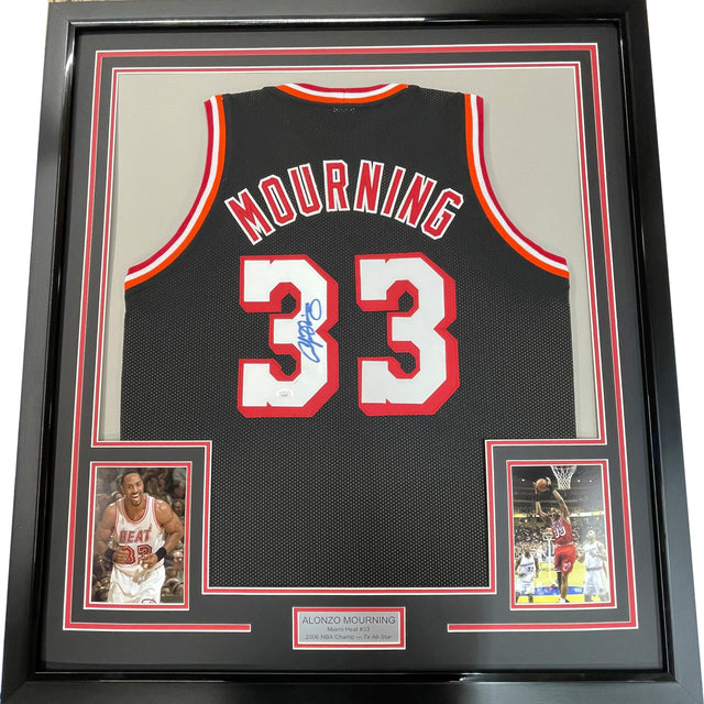 Framed Autographed/Signed Alonzo Mourning 35x39 Miami Black Basketball Jersey JSA COA