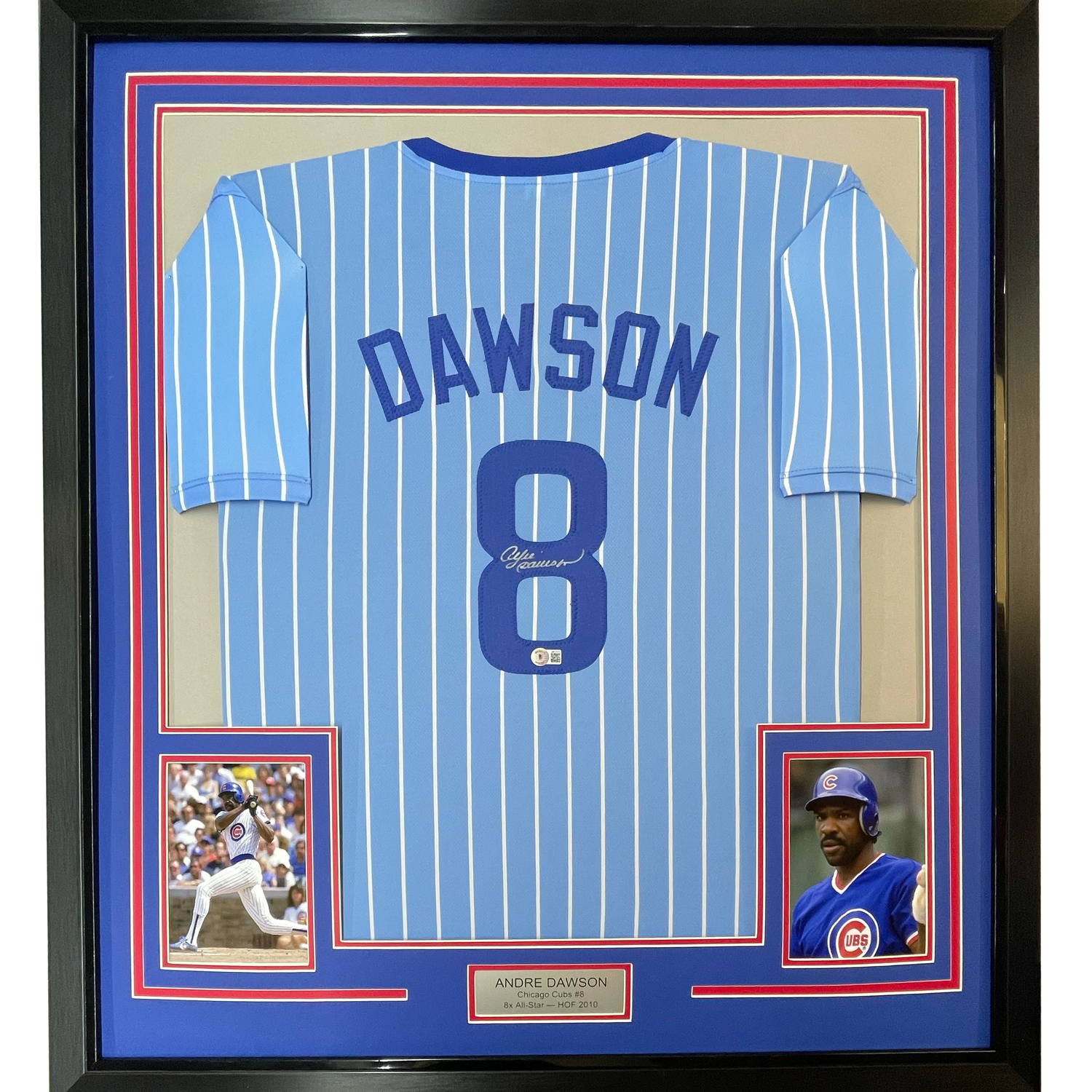 Framed Autographed/Signed Andre Dawson 35x39 Chicago Pinstripe Blue Baseball Jersey JSA COA