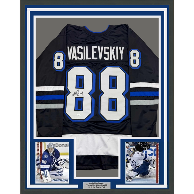 Framed Autographed/Signed Andrei Vasilevskiy 35x39 Tampa Bay Black Hockey Jersey JSA COA