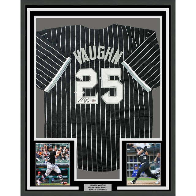 Framed Autographed/Signed Andrew Vaughn 35x39 Chicago Black Pinstripe City Edition Baseball Jersey Beckett BAS COA is backordered and will ship as soon as it is back in stock.