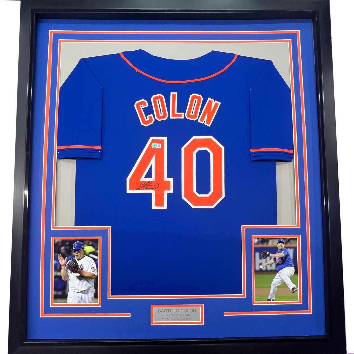 Framed Autographed/Signed Bartolo Colon 35x39 New York Blue Baseball Jersey Beckett BAS COA
