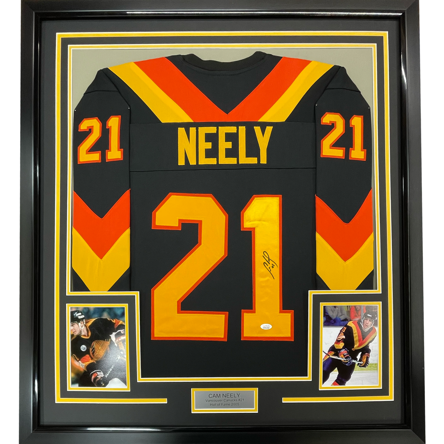 Framed Autographed/Signed Cam Neely 35x39 Vancouver Black Hockey Jersey JSA COA