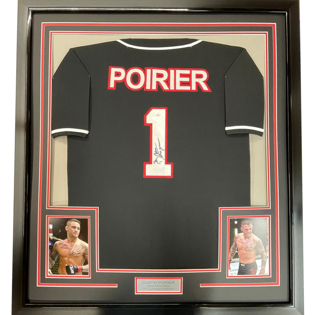 Framed Autographed/Signed Dustin Poirier 35x39 UFC MMA Black Ultimate Fighting Jersey Shirt PSA/DNA COA