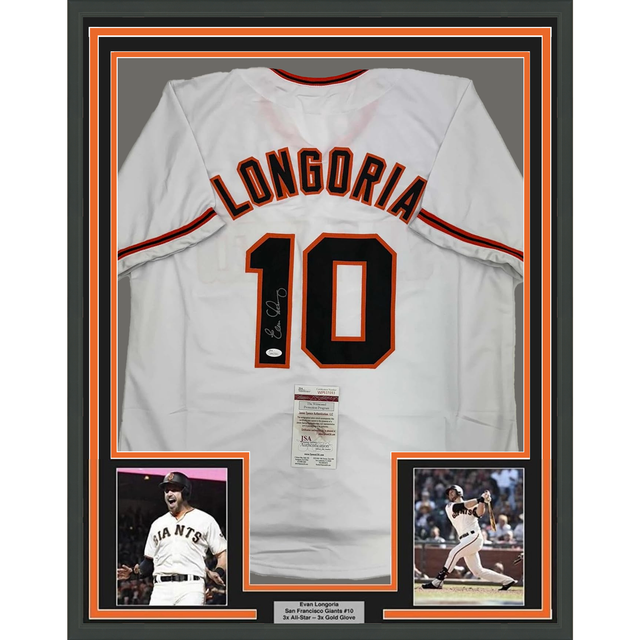 Framed Autographed/Signed Evan Longoria 35x39 San Francisco White Baseball Jersey JSA COA is backordered and will ship as soon as it is back in stock.