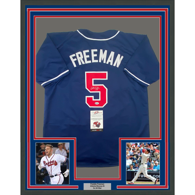 Framed Autographed/Signed Freddie Freeman 35x39 Atlanta Blue Baseball Jersey Lojo Exclusive COA is backordered and will ship as soon as it is back in stock.