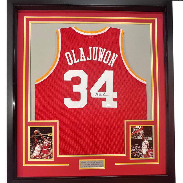 Framed Autographed/Signed Hakeem Olajuwon 35x39 Houston Red Basketball Jersey Beckett BAS COA