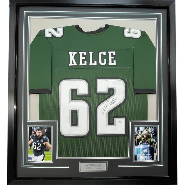 Framed Autographed/Signed Jason Kelce 35x39 Philadelphia Green Football Jersey PSA/DNA COA