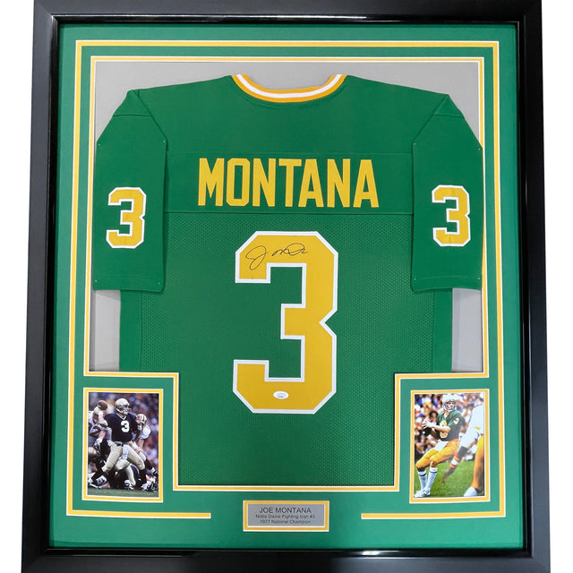 Framed Autographed/Signed Joe Montana 35x39 Notre Dame Green College Football Jersey JSA COA