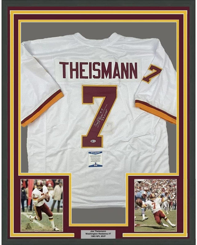 Framed Autographed/Signed Joe Theismann 35x39 83 MVP Washington White Football Jersey Beckett BAS COA