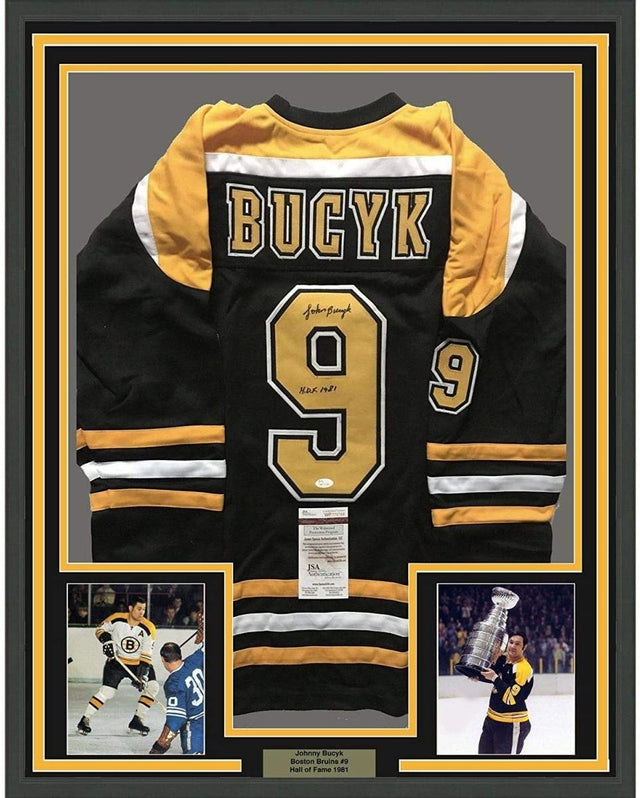 Framed Autographed/Signed John Johnny Bucyk HOF 1981 35x39 Boston Black Hockey Jersey JSA COA