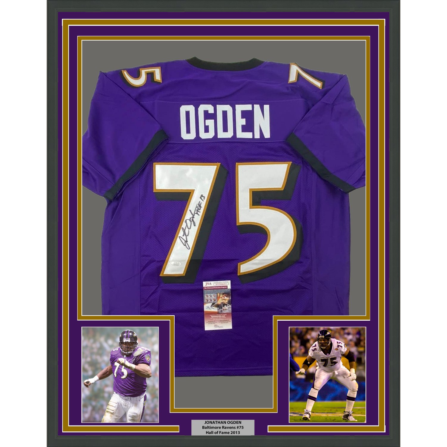 Framed Autographed/Signed Jonathan Ogden 35x39 HOF 13 Baltimore Purple Football Jersey JSA COA is backordered and will ship as soon as it is back in stock.