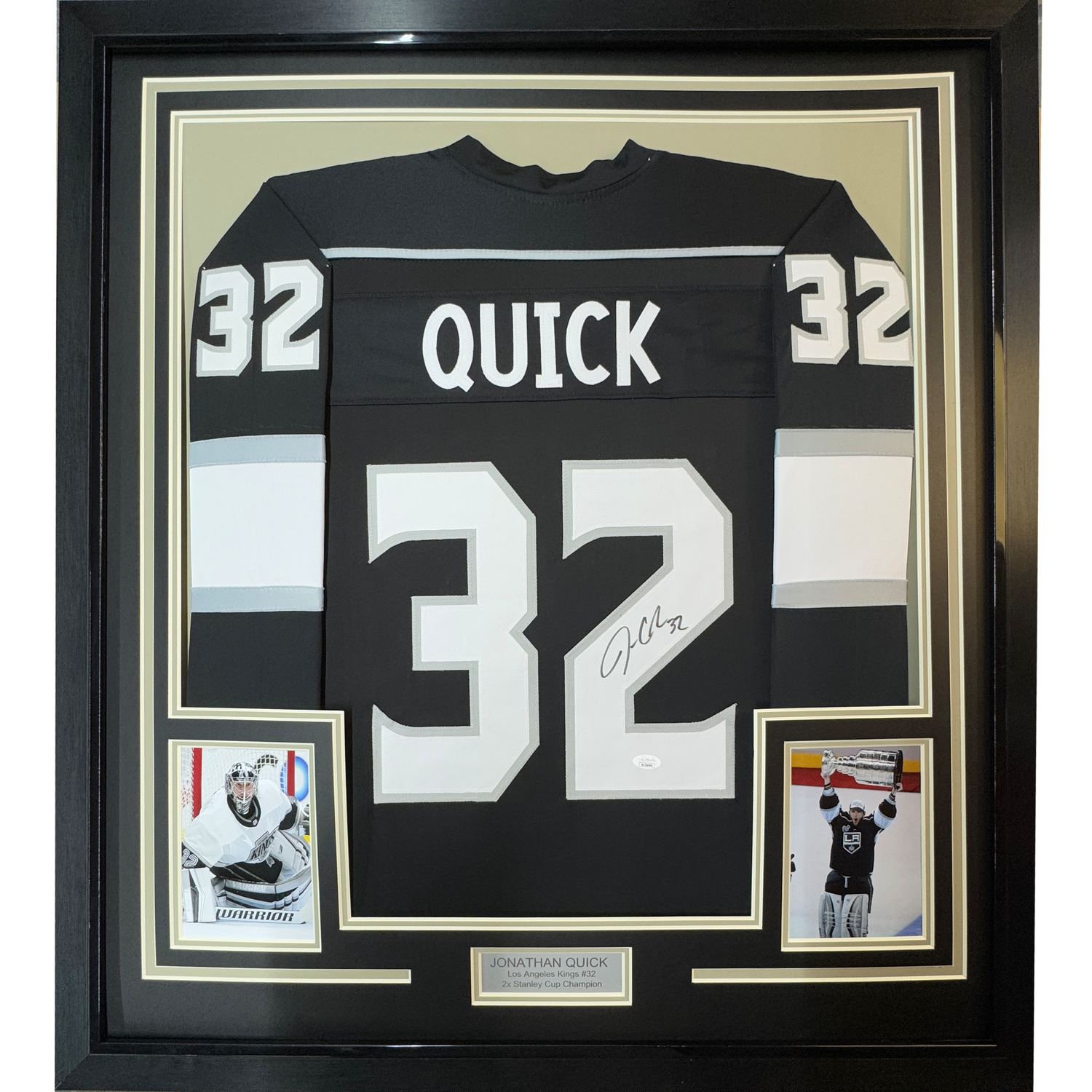 Framed Autographed/Signed Jonathan Quick 35x39 Los Angeles LA Black Hockey Jersey JSA COA