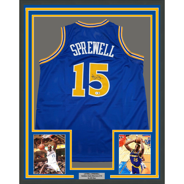 Framed Autographed/Signed Latrell Sprewell 35x39 Golden State Blue Basketball Jersey Beckett BAS COA